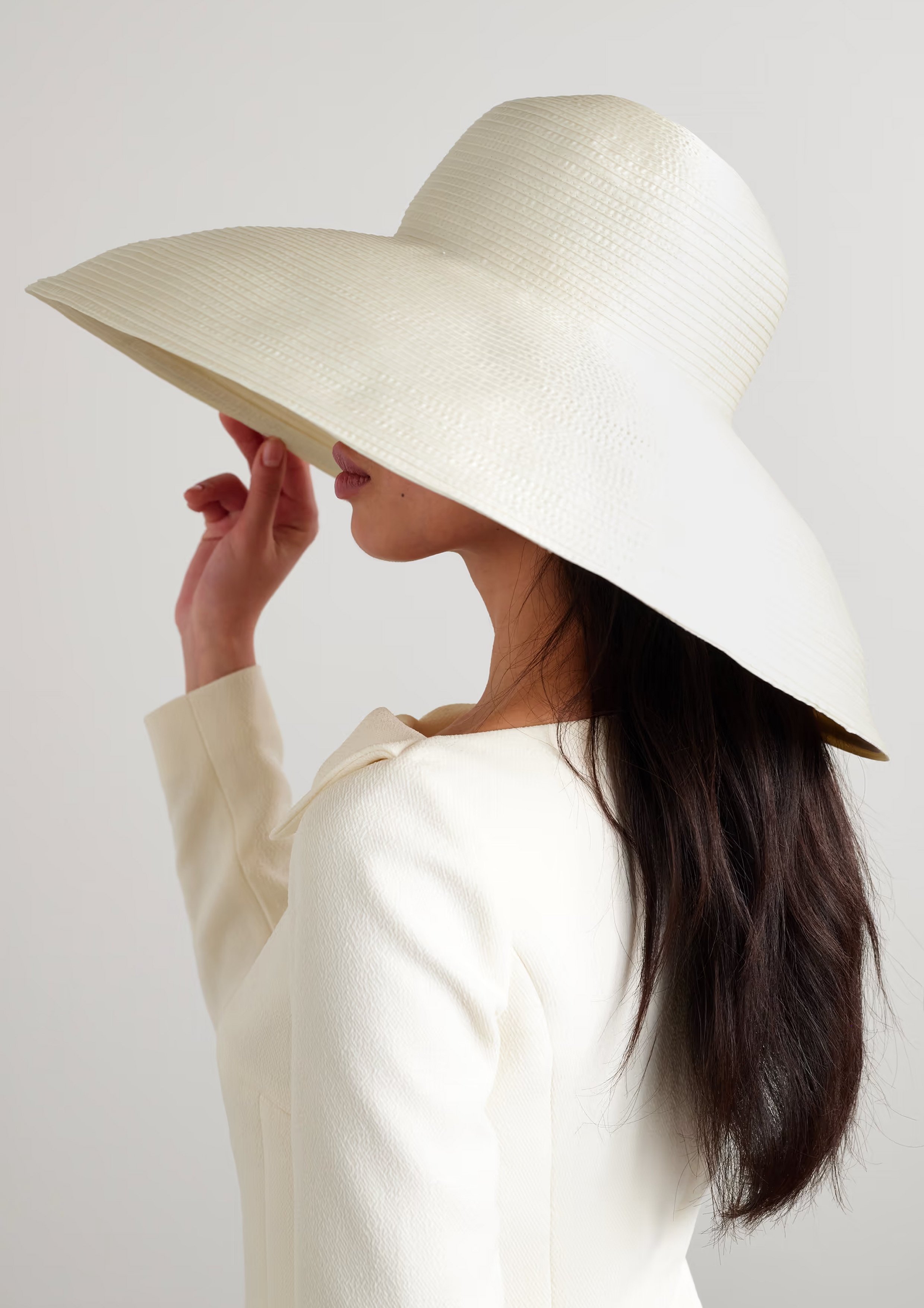 An oversized hat in ivory silk can take the simplest wedding dress or tailored suit from beautiful to sublime. Striking and pure as is or as a base for ribbon, bejewelled embellishment or bountiful florals,